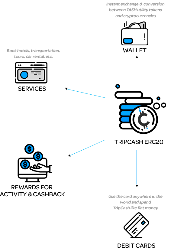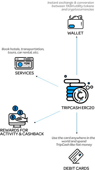 TripCash is the official ERC20-compliant utility token of the Smart Trip Platform and will be used to book travel services on the platform. Users will be able to store both TripCash and a wide range of cryptocurrencies in their individual Universal Cryptocurrency Wallet (UCW), instantly exchanging between them; in the second stage of the project, Debit Cards (TripСash Cards) will be introduced, making it possible to use TripCash to make online and offline purchases.